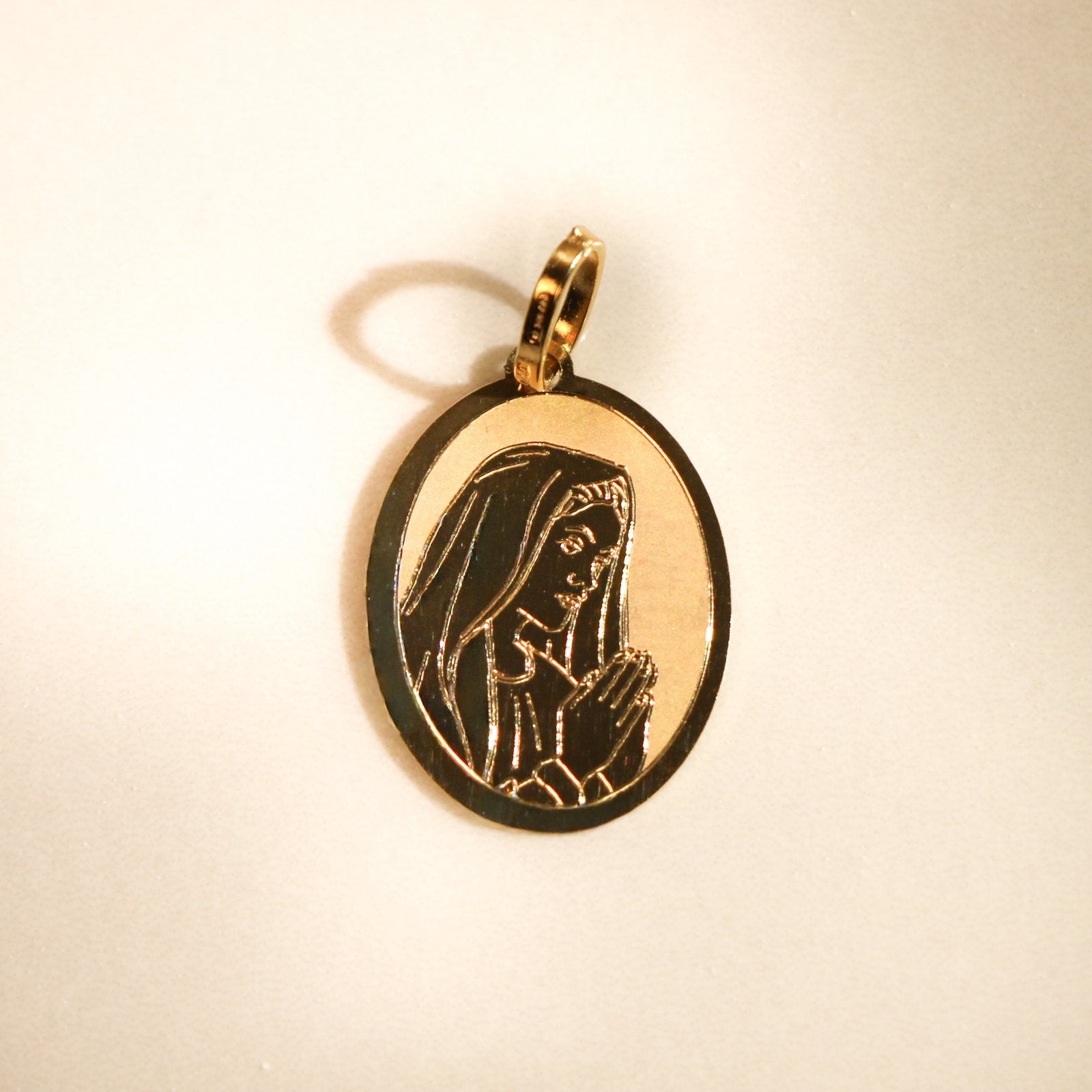 This oval medal depicts the Virgin praying through delicate ornamental engraving. The fineness of the details and the warm glow of the gold give this piece of jewelry a sacred and elegant character.