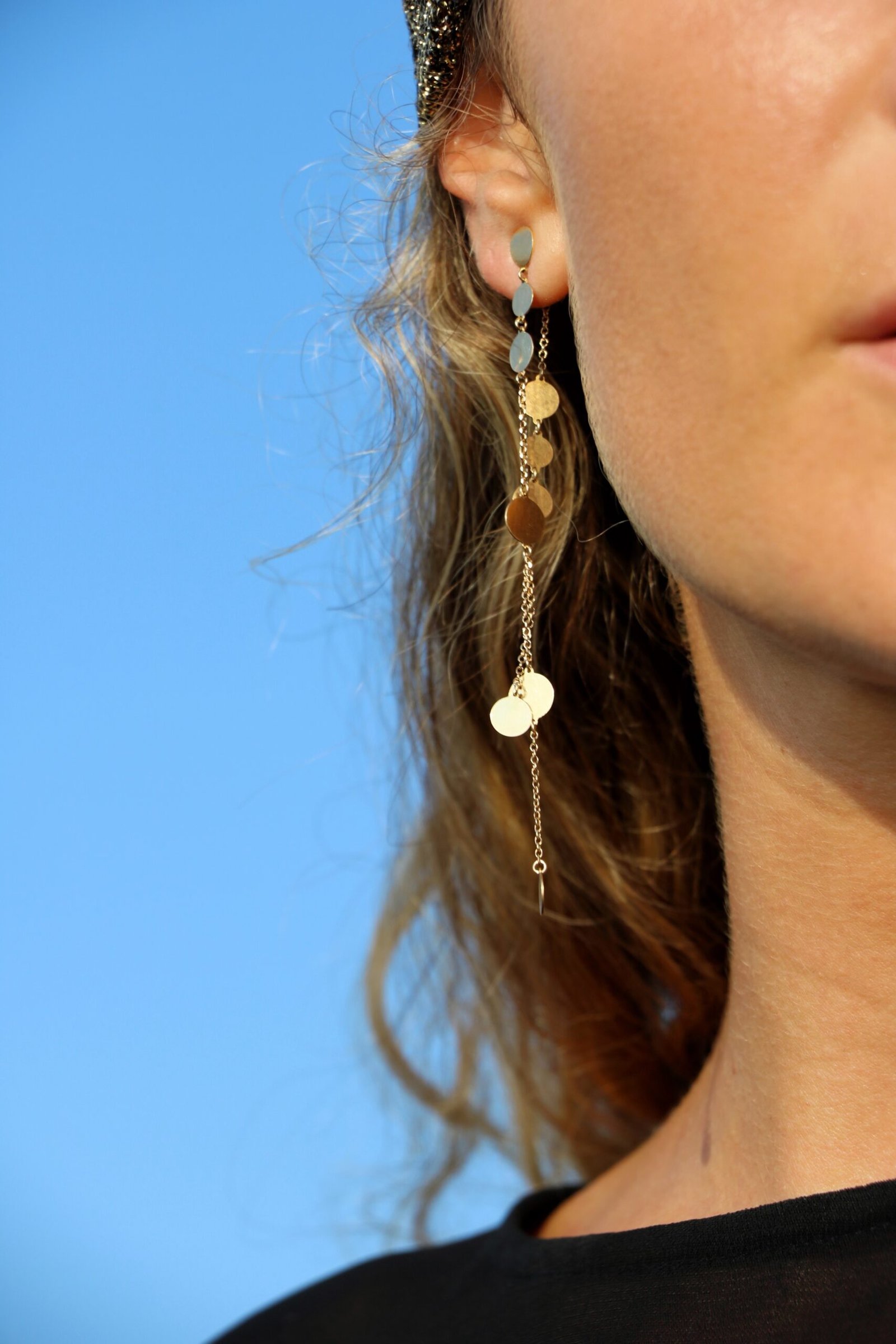 Féeriques et étincelantes, les boucles d’oreilles Delphes suivront la courbe de votre visage en cascade lumineuse, captant la lumière de la pièce à chacun de vos mouvements. Légères à porter, elles apporteront une touche de glamour à vos tenues de soirées.
