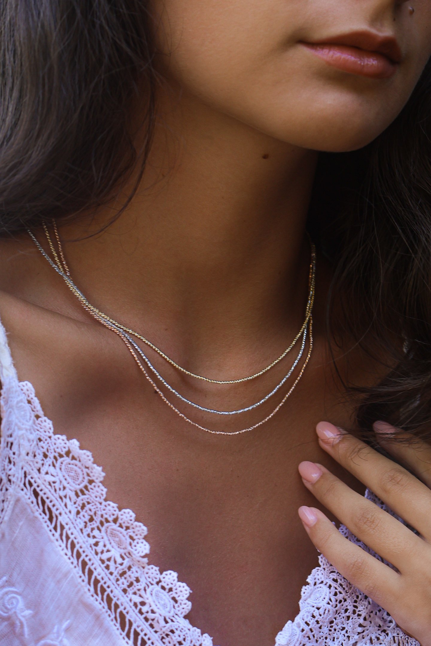 Ce collier séduit par son scintillement exceptionnel et sa simplicité. Façonné grâce à la technique de ” l’or diamanté ” , le métal est finement découpé à l’aide de pointes de diamants, créant de multiples facettes qui captent et reflètent la lumière. À porter aussi bien au quotidien que pour habiller vos tenues de soirées.