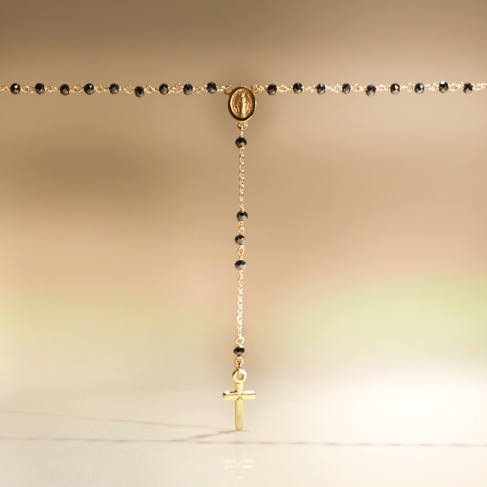 Orné de perles en onyx noires et légèrement de bleu irisées, ce chapelet d’une extrême élégance se porte aussi bien  au quotidien que pour habiller vos plus belles tenues de soirées.