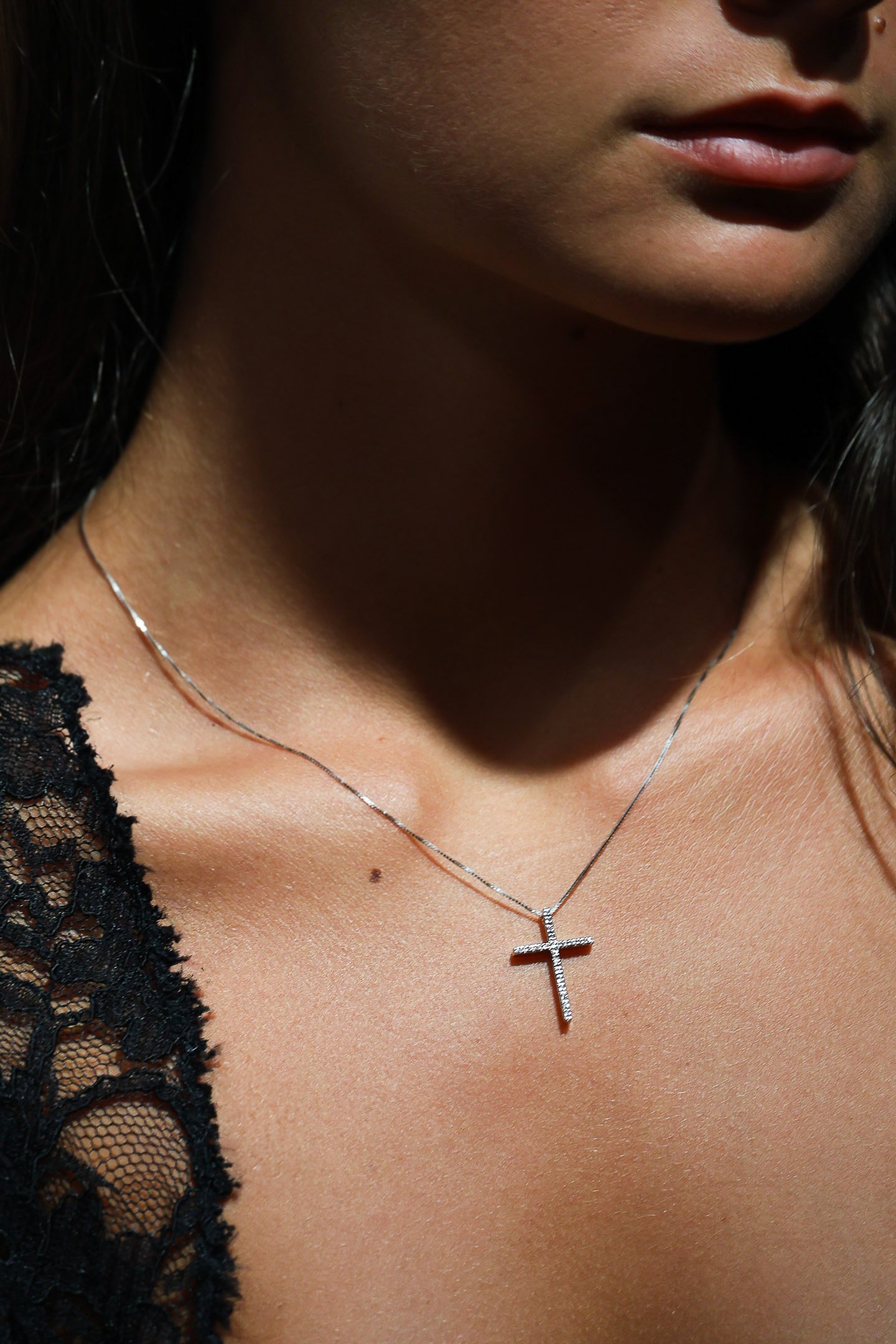Le collier Lavinia serti de diamants blancs vous séduira par son émouvante simplicité. Empreinte de spiritualité, cette croix, fine, moderne et épurée, réhaussera vos tenues de jour comme de nuit.