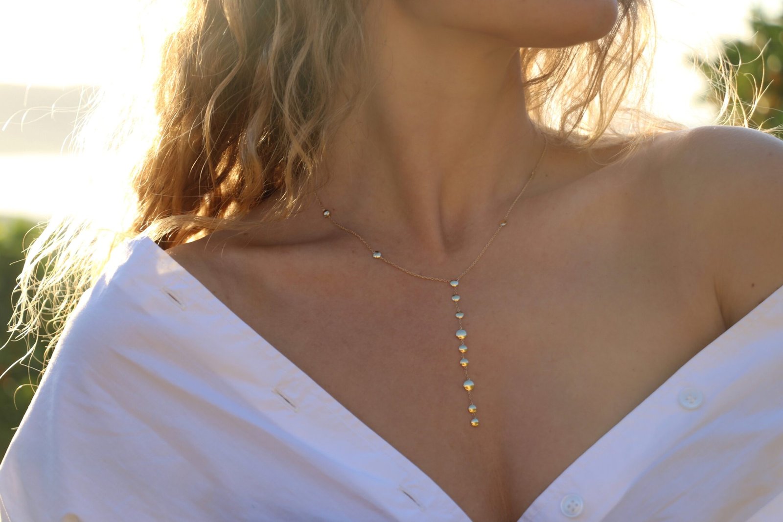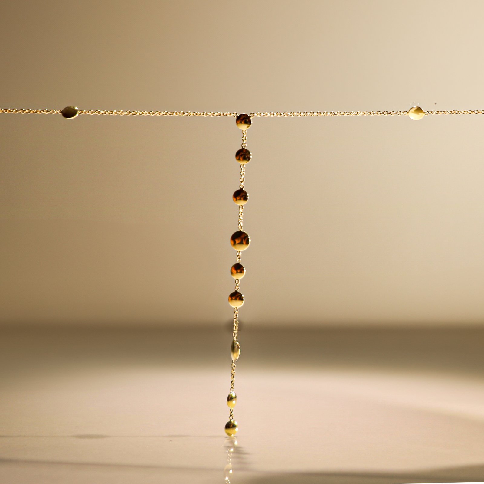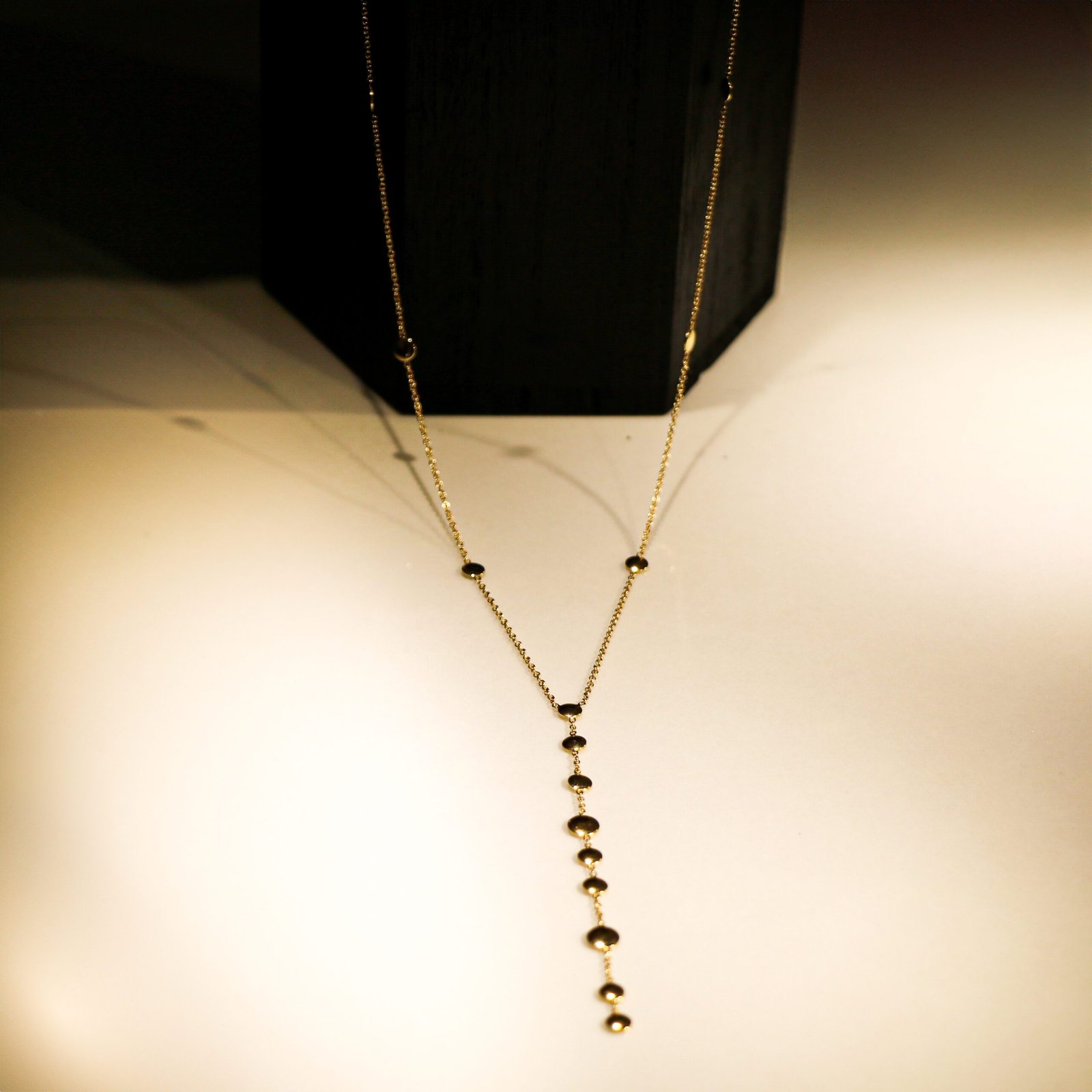 Ce collier habillera vos décolletés en une cascade féerique de gouttes d’or clairsemées. Captant la lumière à chaque mouvement. Sophistiqué et lumineux, il apportera une touche d’éclat à vos tenues de soirées.