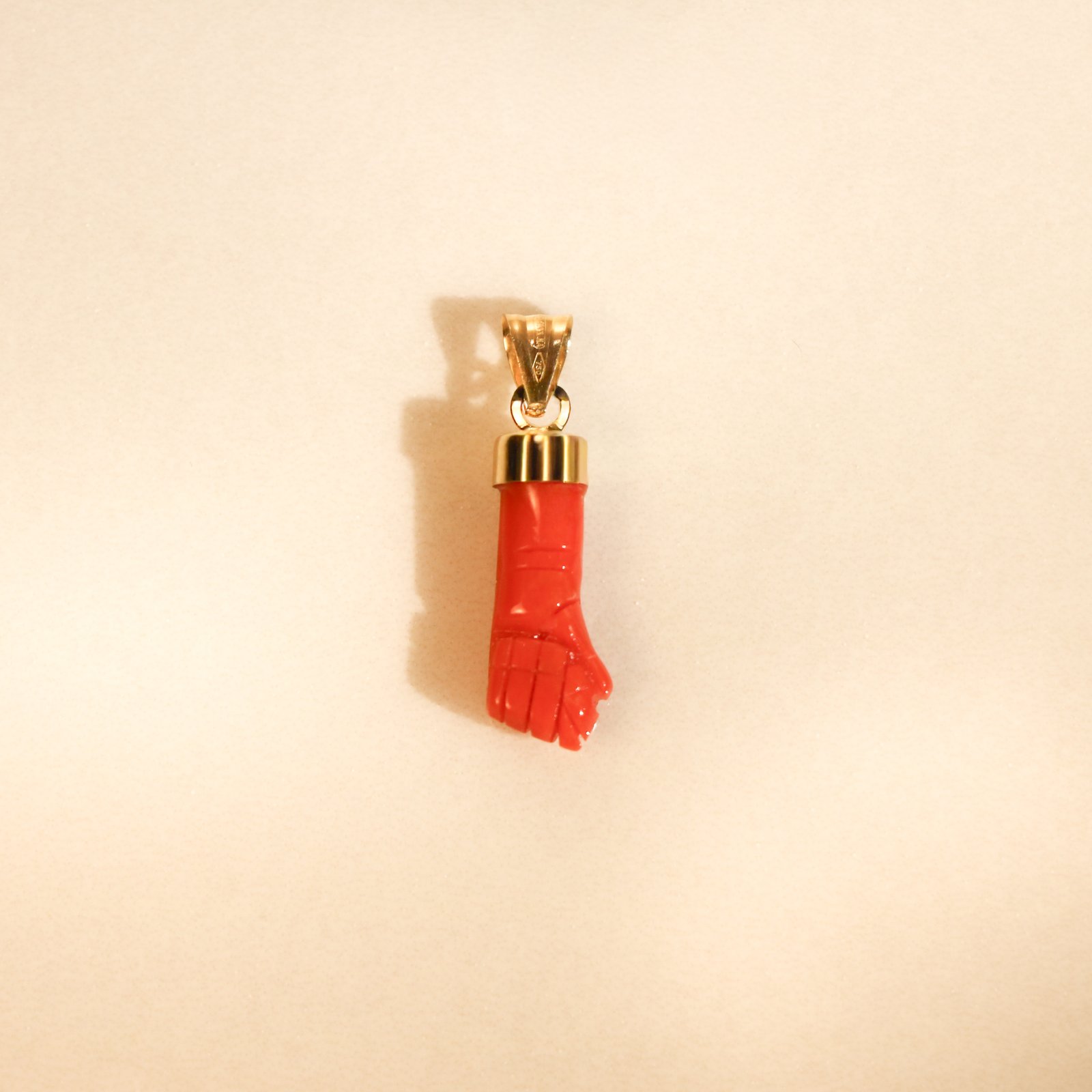 Ce pendentif porte-bonheur représente un poing façonné en corail. Dans la culture méditerranéenne cet objet éloigne le mauvais œil depuis la nuit des temps. Chaque pendentif est unique et réalisé à la main.
